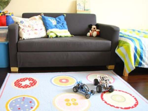 ▲ポップなラグは水色でこれまたさわやか! 全体を締めるココアブラウンのソファーにもぬいぐるみを飾ってにぎやかに。クッションは2つ3つあった方がバランス良い感じですね。ソファーは洗いにくいのでシックな色で正解ですね。