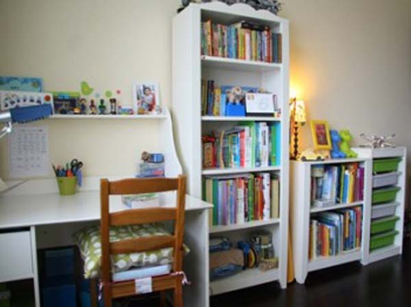 ▲勉強スペースは真っ白にして頭を冴えさせて! 邪念を取り払うことで成績がアップするかもしれません。本棚は全部を背の高いタイプにせず、ミニサイズも並べることがポイント。圧迫感を軽減できるそうです。